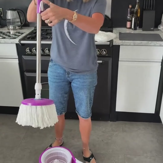 El trapeador cuenta con un giro de 360° y un mango resistente de fácil agarre para una limpieza rápida y fácil.